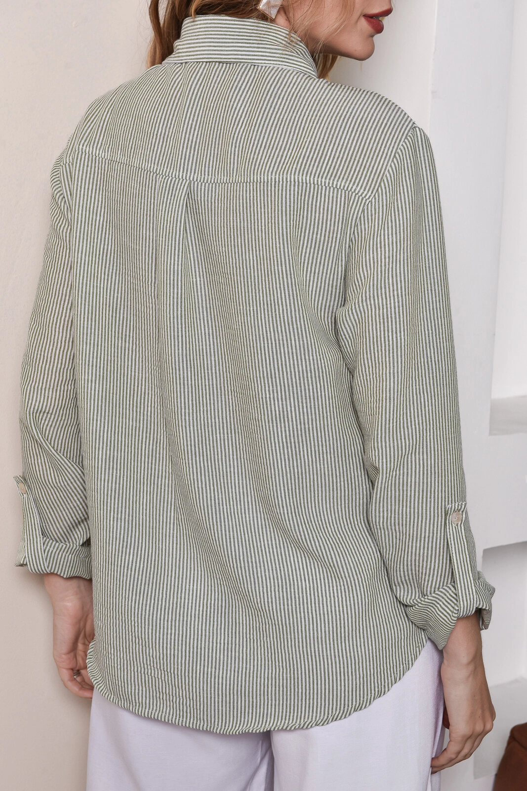 Camisa Textura Linho Listrada Floral Azul Marinho